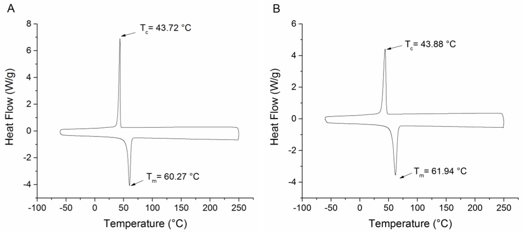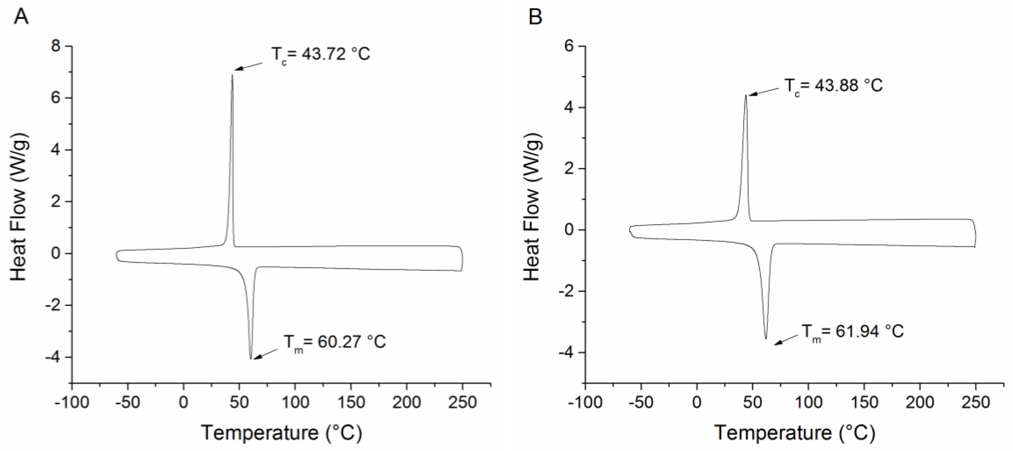 Figure 7 illustrates DSC analysis results obtained from the second and third cycles of the blue and red PEO-PDA fibers, respectively. The melting temperature (Tm) and crystallization temperature (Tc) were calculated from the second and third heating cycle, after the thermal history of the mixture of PEO and PDA had been removed. Figure 7A shows the data collected from the blue fibers where Tc was 43.72 °C, and the Tm was 60.27 °C. Similarly, Figure 7B depicts the data from the red fibers where the Tc was 43.88 °C, and the Tm was 61.94 °C.