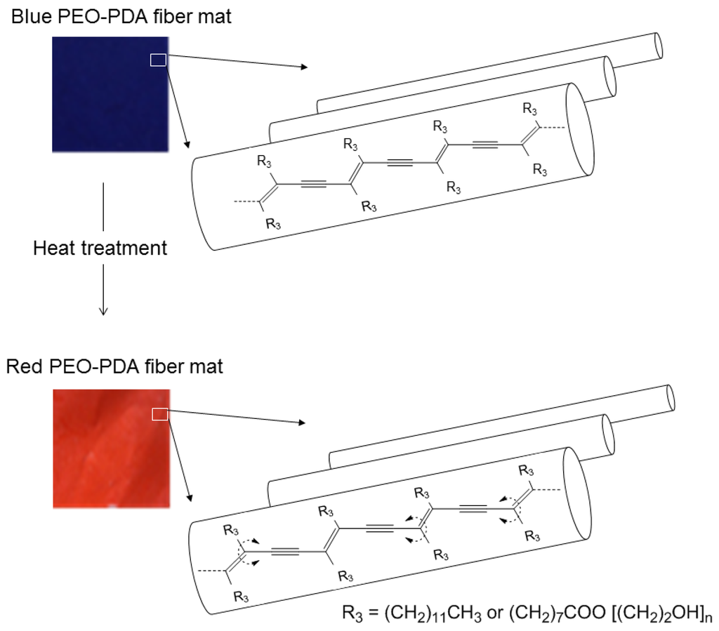 An illustration of color transition from blue to red in PEO-PDA fiber mat, which is due to a C-C bond rotation induced by heat treatment.