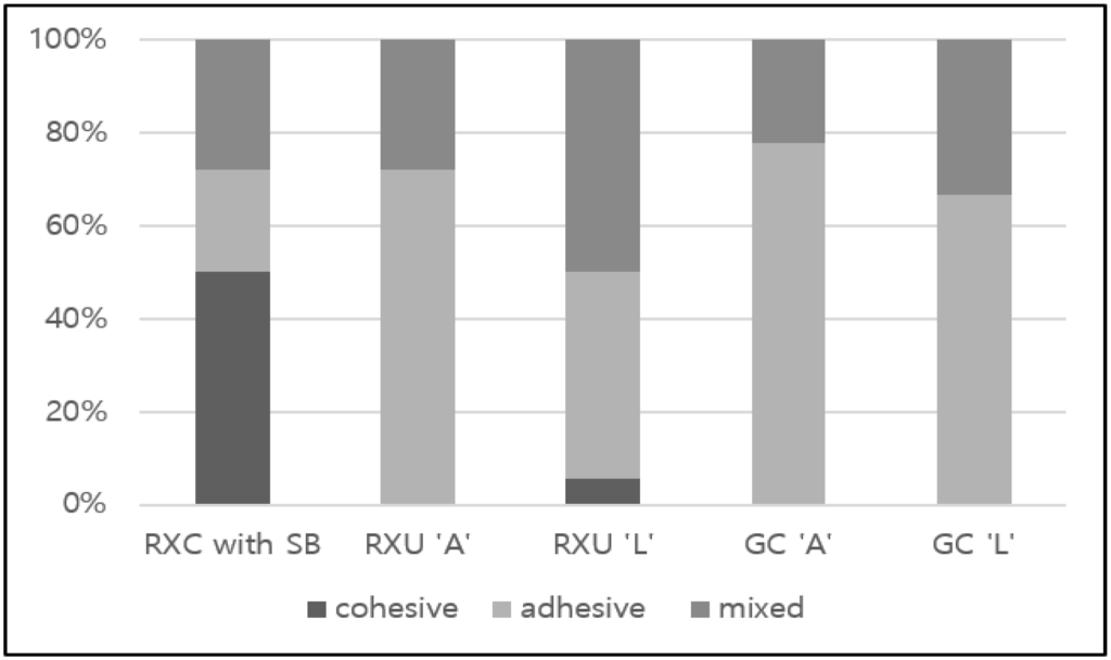 SEM photomicrographs of fractured surfaces: (a) Cohesive fracture pattern showed on RXU group with SB; (b,d) Mixed fracture pattern showed on RXU L and GC L group; (c) Adhesive fracture pattern showed on GC A group.