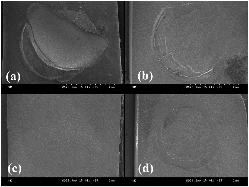 The failure pattern distribution (%) of each group is shown in Figure 2. Most of the groups except RXC and RXU L revealed adhesive failure patterns along the resin cement-CAD/CAM resin block interface predominantly. Figure 3 shows the representative SEM micrographs of the fractured block sides. The RXC group showed a predominant cohesive failure mode in its CAD/CAM composite failure (Figure 3a). In a specimen of the RXU L and GC L groups, an adhesive failure region along the block-cement interface revealed a remnant of resin cements (Figure 3b,d). In a specimen of the GC A group, complete separation of the luting cement from the CAD/CAM composite blocks was shown (Figure 3c).