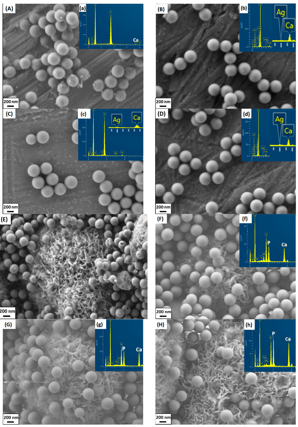 Scanning electron microscopy (SEM) images of samples before and after soaking in SBF for 7 days. (A) BGNs; (B) Ag-25; (C) Ag-60; (D) Ag-80; (E) BGNs 7d; (F) Ag-25 7d; (G) Ag-60 7d; (H) Ag-80 7d. Inserted are the corresponding energy-dispersive X-ray spectroscopy (EDS) results.