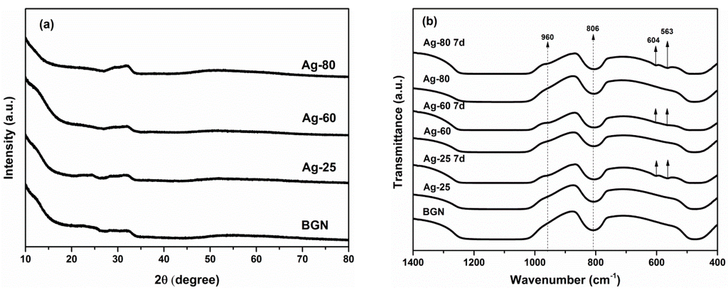 (a) X-ray diffraction (XRD) patterns of BGNs and surface modified Ag-BGNs; (b) Fourier-transform infrared spectroscopy (FTIR) spectra of Ag-BGNs before and after soak in SBF for 7 days.