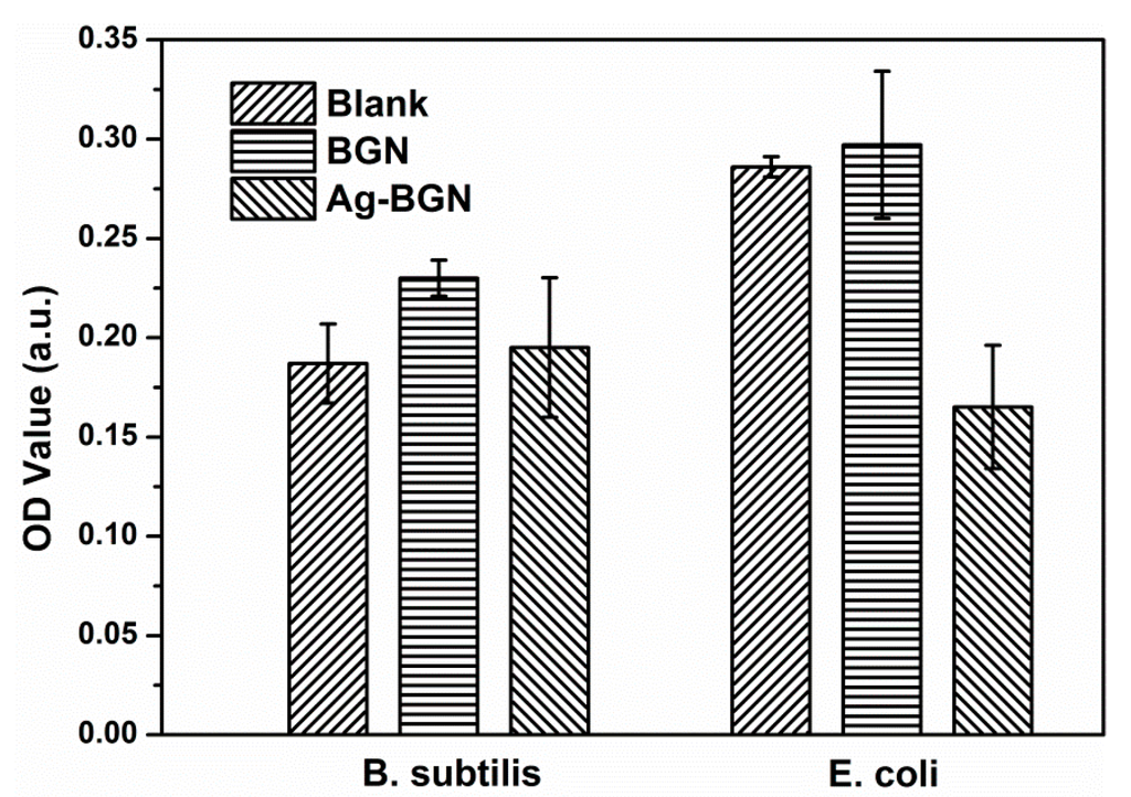 Ag-25 was selected for antibacterial tests as it had the lowest content of Ag (Table 1). Higher Ag contents should lead to stronger antibacterial activity, but they present possible cytotoxic effects. The results of antibacterial tests are shown in Figure 3. As expected, BGNs did not show antibacterial effects on both E. coli and B. subtilis As a comparison, Ag-25 exhibited antibacterial effects on E. coli, while no effects towards B. subtilis could be observed. This result could be due to the low concentration of Ag in Ag-25, and the released Ag+ ions could not reach the minimum inhibitory concentration of B. subtilis. Previous research has shown that Gram-negative E. coli was more susceptible to silver than Gram-positive Staphylococcus aureus due to the difference in cell walls structure [,]. Considering the antibacterial effects of Ag-25, it can be concluded that all modified Ag-BGNs produced in this study should possess antibacterial capability.