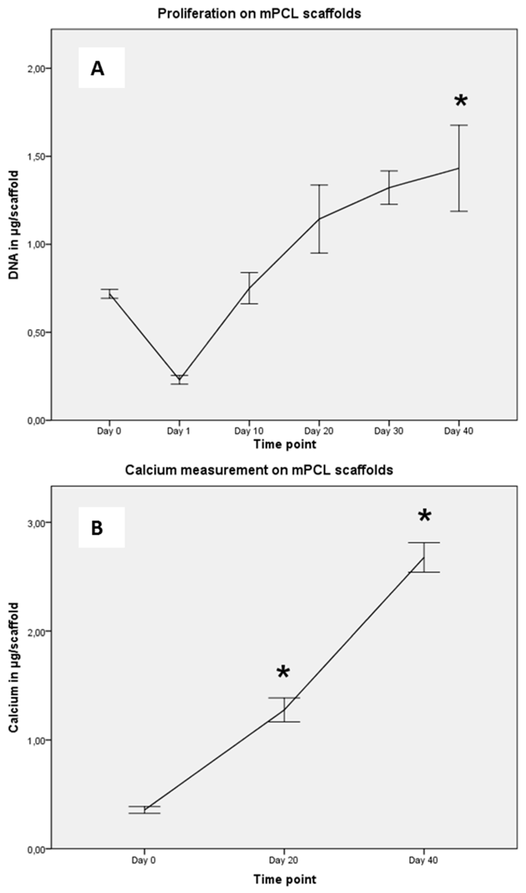 (A) Proliferation potential of osteoblasts (n = 6) was determined on Days 0 (seeding), 1, 10, 20, 30 and 40. Approximately one-third of seeded cells attached to the scaffold (Day 1). Osteoblasts proliferated over 40 days on scaffolds and the number of cells after 40 days was significantly higher than at Day 0 (p < 0.05) as measured in µg DNA per scaffold. A plateau-like phase was reached after 20 days; (B) Extracellular matrix deposition of osteoblasts was measured with significantly more calcium deposited at later time points than at seeding (p < 0.05). Intra- and extracellular calcium was measured in µg/scaffold and showed a linear fashion.