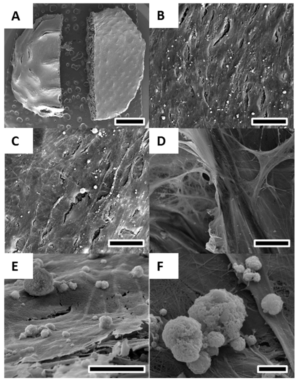SEM of osteoblasts cultured for 40 days in osteogenic differentiation media on melt electrospun scaffolds. (A) Overview revealed a solid layer of osteoblasts covering the entire scaffold on both the convex (B) and concave (C) side; (D) Cell detection and calcium deposition on the inside of the scaffold demonstrating infiltration of cells into the porous scaffold structure; (E,F) High resolution image of calcium deposits formed by osteoblasts on the cell layer surface. Scale bars: 2 mm (A); 25 μm (B–D); 10 μm (E); and 2 μm (F).