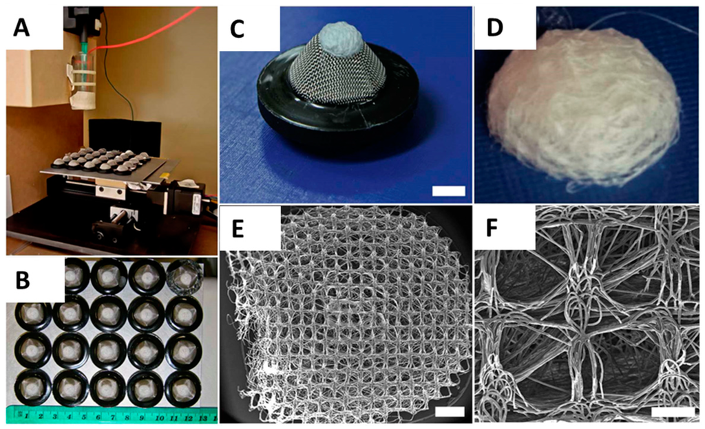 Melt electrospun scaffolds were fabricated with PCL (MW) 80,000 g/mol (Sigma Aldrich, Castle Hill, Australia), onto structured electroconductive collectors as described previously [4,17,57]. Briefly, PCL pellets were placed into a 3 mL Luer lock syringe (B-Braun, Bella Vista, Australia) and heated to 80 °C with the syringe held upright (Figure 5A). A blunt 23G needle attached to the syringe was used as a spinneret and placed into a water-circulating system heated to 80 °C. The PCL melt was electrospun using a spinneret-collector distance of 50 mm, a flow rate of 10 μL/h and a voltage of 20 kV applied to the spinneret. The melt electrospun PCL-fibres were collected onto an array of 20 dome-shaped wire mesh collectors upon a grounded moving plate. Each collector possessed a similar 250 μm × 250 μm square void template architecture with rubber rings around the base of each filter to provide a separating air gap to minimise disturbing influences on the jet’s path from the adjacent collector (Figure 5B,C). The steel mesh of each collector was the highest point on the collector and was positioned directly under the spinneret for the 20 min duration of fibre collection to produce a 3D scaffold (Figure 5C,D). Figure 5E,F reveals the heterogeneous structure on the concave of the scaffold, where the open square shaped 250 μm pores match the architecture of the collector mesh. After 20 min of fibre collection, an automated x-y-stage was used to move the molten PCL jet to the next collector.