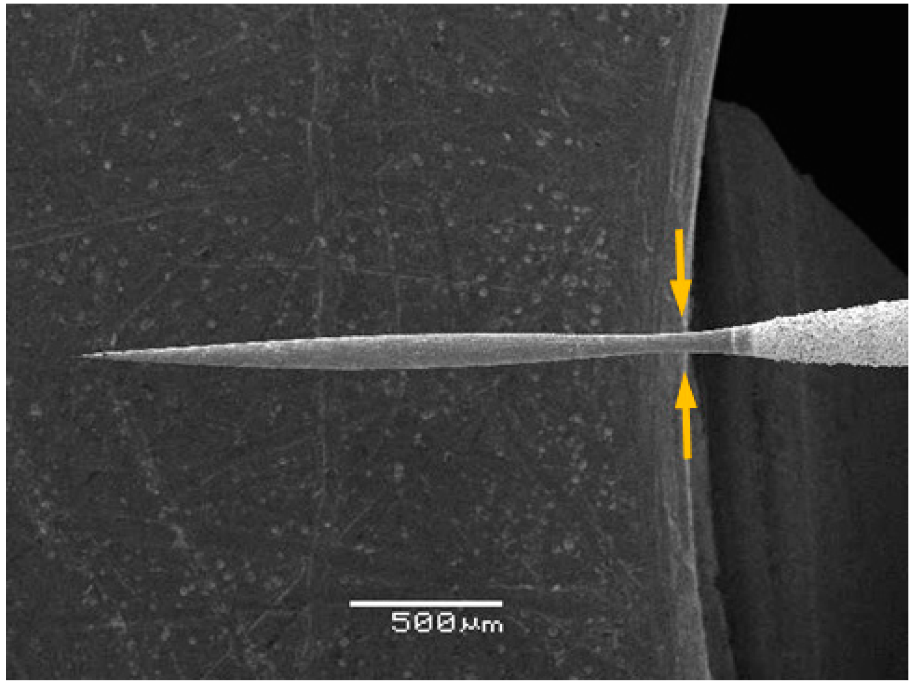 - Yi, Z.; Zhang, M. Fabrication of high-aspect-ratio platinum probes by two-step electrochemical etching. Rev. Sci. Instrum. 2015, 86. [Google Scholar] [CrossRef] [PubMed]