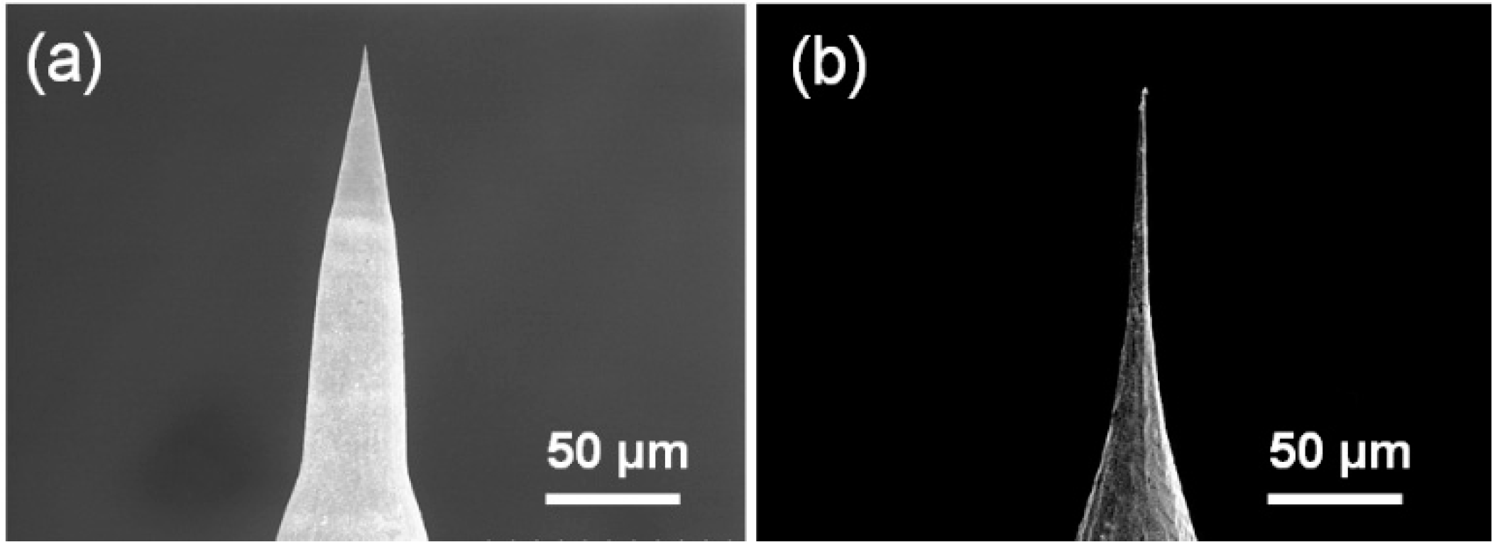 SEM images of the platinum probes fabricated by two-step etching process with different counter-electrode shape. (a) Graphite rod electrode; (b) Graphite crucible electrode with a diameter of 30 mm.