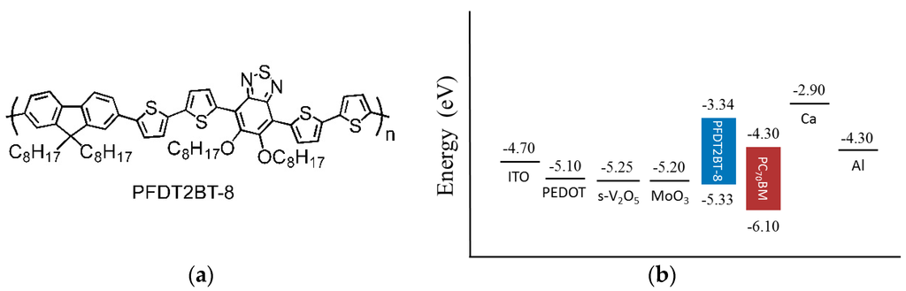 (a) The chemical structure of PFDT2BT-8; and (b) energy levels of electrodes, HELs, and active layer materials used in this work.