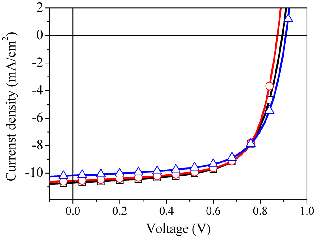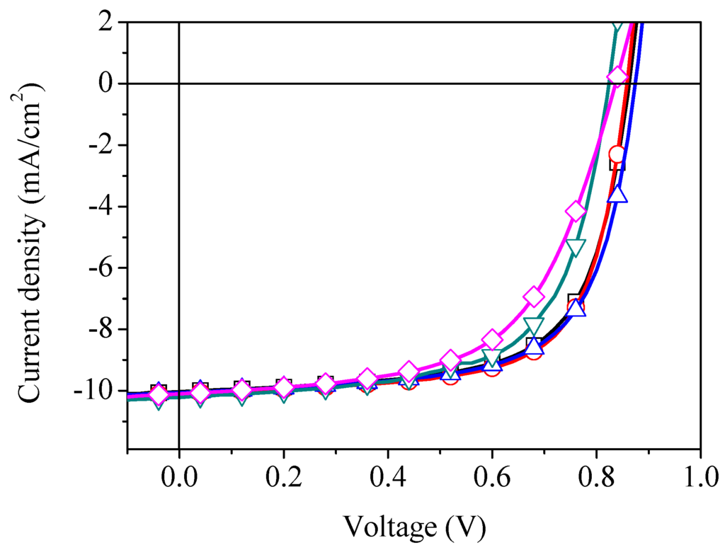 The current density-voltage characteristics of organic solar cell with (□) unannealed s-V2Ox interlayer and annealed at (