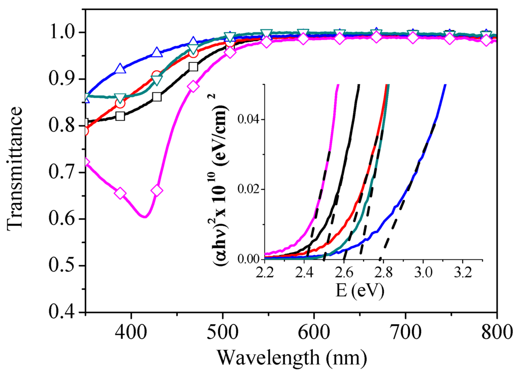 Using Tauc’s Law, the optical band gap of s-V2Ox films was determined [25,27]. The relationship between the band gap energy () and the absorption coefficient (α) can be represented as: