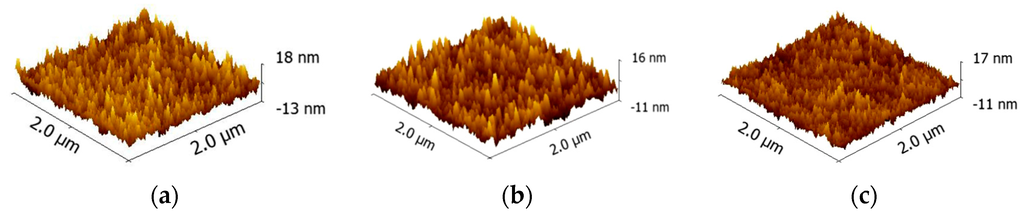 AFM topography (2 µm × 2 µm) of a 10 nm thick s-V2Ox layer deposited on top of Si with native oxide; (a) as deposited; (b) annealed at 200 °C; (c) annealed at 400 °C. The average grain size was 21.3 nm, 16.8 nm, and 19.6 nm, respectively.