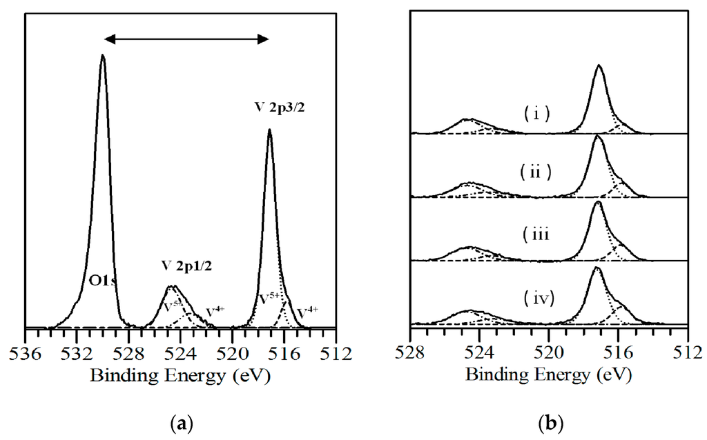 - Silversmit, G.; Depla, D.; Poelman, H.; Marin, G.B.; de Gryse, R. Determination of the V2p XPS binding energies for different vanadium oxidation states (V5+ to V0+). J. Electron Spectrosc. Relat. Phenom. 2004, 135, 167–175. [Google Scholar] [CrossRef]