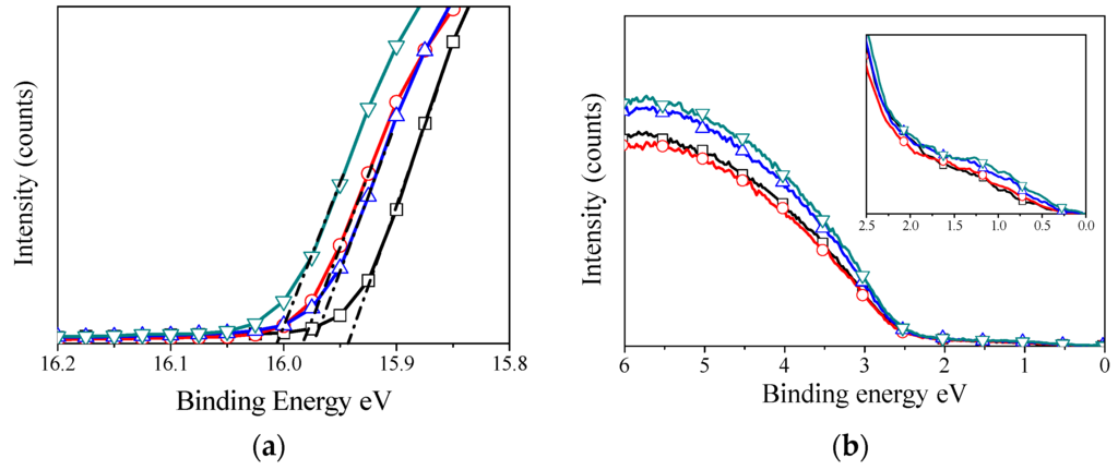 The UPS and XPS measurements were carried out using KratosUltra AXIS photoelectron spectroscopy (Kratos Analytical Ltd., Manchester, UK). XPS measurements were taken using the Al Kα radiation with an energy of 1486.6 eV as the excitation source, a band pass energy of 10 eV, a step size of 0.025 eV, and a dwell time of 250 ms. UPS measurements were taken using the He (I) emission line (21.2 eV), a band pass energy of 10 eV, a step size of 0.025 eV, and a dwell time of 250 ms.