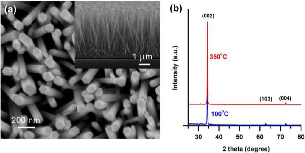 (a) SEM micrograph of ZnO nanorods grown on glass substrate using a microwave-assisted hydrothermal process. The sample was annealed at 350 °C in air for 1 h, followed by the growth. Inset shows the cross-sectional view of the vertically aligned ZnO nanorods; (b) XRD patterns of ZnO nanorods annealed at 100 and 350 °C in order to vary the concentrations of surface defects in the nanorods.