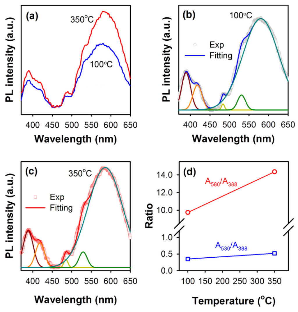 Surface defects in the ZnO nanorods modulated by annealing them at two different temperatures were then characterized by photoluminescence (PL) and X-ray photoelectron spectroscopy (XPS) techniques. The room temperature PL spectra of ZnO nanorods annealed at 100 and 350 °C are shown in Figure 2a, where emissions in both the UV and visible regions are observed. The PL bands in the high energy region are found to be composed of two major Gaussian components, peaking at around 388 nm (~3.2 eV) and 418 nm (~2.9 eV), respectively, as shown in Figure 2b,c, representing the band-to-band transitions in ZnO and a radiative transition from a defect state situated near the conduction band (CB) of ZnO, respectively. Deep-level zinc interstitial (Zni) defects, typically found at ~0.22 eV below the CB of ZnO, are reported as the possible origin of the violet emission from ZnO [31].