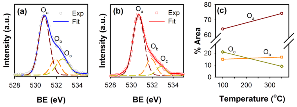 In order to further verify the chemical states of oxygen near the surface of the annealed ZnO nanorods, we carried out XPS measurements on the ZnO nanorods annealed at 100 and 350 °C. Figure 3 shows the asymmetric O1s XPS spectra of the ZnO nanorods annealed at different temperatures. Both asymmetric O1s XPS spectra were coherently fitted by three Gaussian components, centered at 530.6 eV (Oa), 531.9 eV (Ob) and 532.6 eV (Oc), respectively, as shown in Figure 3a,b. The Oa peak on the lower binding energy side of the O1s spectrum can be attributed to the O2− ions which are surrounded by zinc atoms with the full supplement of nearest-neighbor O2− ions [34]. Thus, the Oa peak of the O1s spectrum can be attributed to the Zn–O bonding. The Oc peak towards the higher binding energy at 532.6 eV is usually associated with the chemisorbed or dissociated oxygen or OH species on the surface of ZnO, such as adsorbed H2O or adsorbed O2 [35,36]. The middle component at the binding energy 531.9 eV (Ob) of the O1s spectra is related to the O2− ions that are in oxygen-deficient regions within the ZnO matrix (oxygen vacancies) [37,38]. Therefore, changes in the area under these peaks upon annealing can be correlated to the variations in the chemical states of oxygen at the surface of the ZnO nanorods.