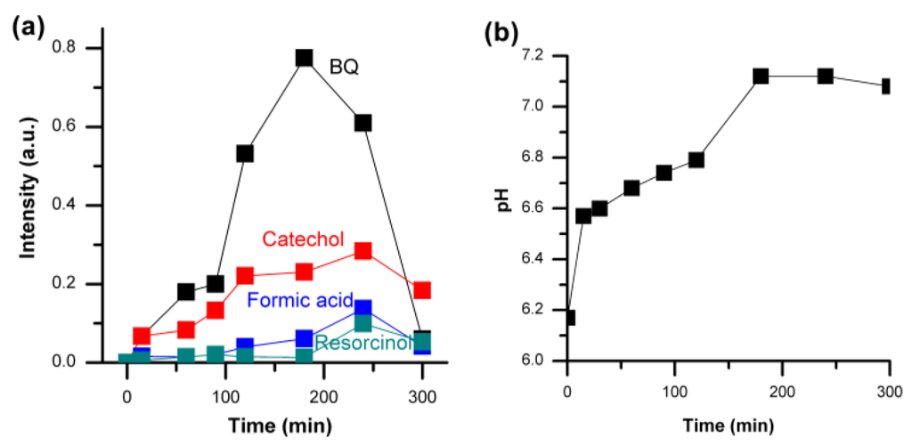 In order to understand the detailed photocatalytic degradation process of phenol pathways, we have studied the formation of byproducts during the degradation of phenol. Degradation of phenol initially starts with the breakage of the O–H bonds, resulting in phenol giving up a proton (H+). It results in the formation of an anion stabilized by the aromatic ring [43]. Figure 5a shows the evolution of different reaction byproducts detected during the photocatalytic degradation of phenol using the ZnO nanorods with higher surface defects. Benzoquinone (BQ), catechol, resorcinol and formic acid were detected as the major byproducts of the phenol photocatalytic degradation under visible light irradiation. The intermediates that could be detected were benzoquinone, catechol, formic acid and resorcinol.