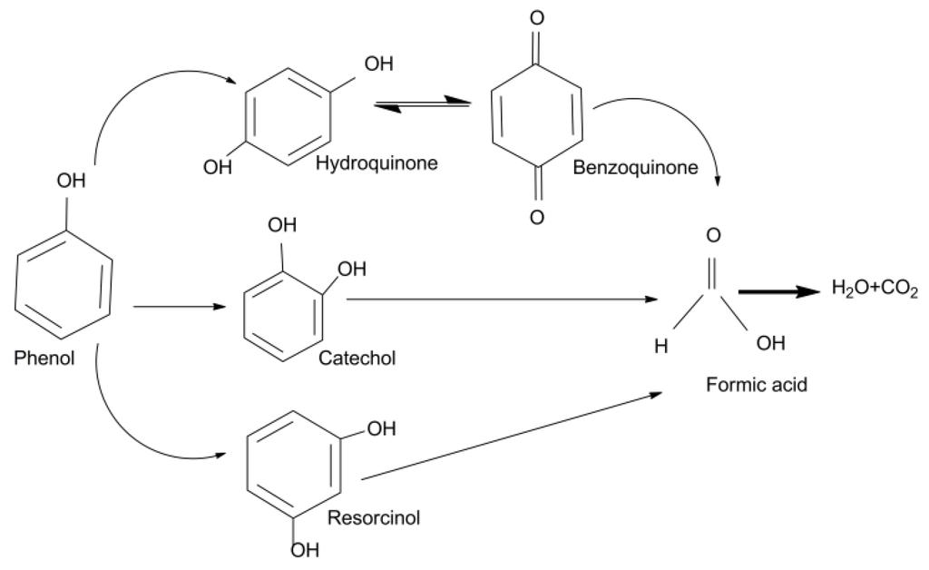 Photocatalytic degradation pathways of phenol under visible light irradiation in the presence of ZnO nanorods with high surface defects as photocatalysts depicting the complete mineralization process of phenol where O–H bonds are broken and resulting in the formation of multiple channels starting with hydroquinone, catechol and resorcinol. Benzoquinone is reversible with hydroquinone. The aromatic ring is opened and results in the formation of aliphatic compounds, such as mineral acids, water and carbon dioxide.