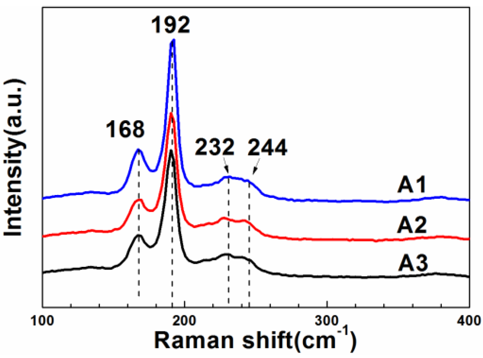The Raman spectra of the CZTSe films that were prepared by the selenization of the precursor with samples A1, A2, and A3.