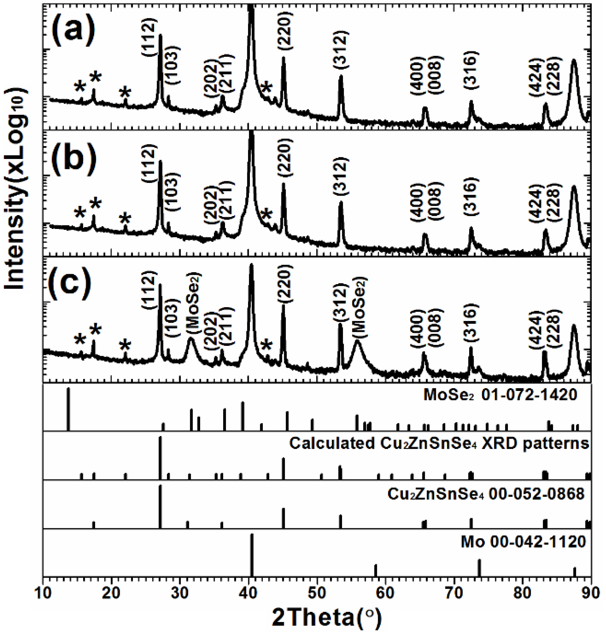 The XRD spectra of the CZTSe thin films that were prepared by the selenization of the precursor with samples (a) A1; (b) A2; and (c) A3.