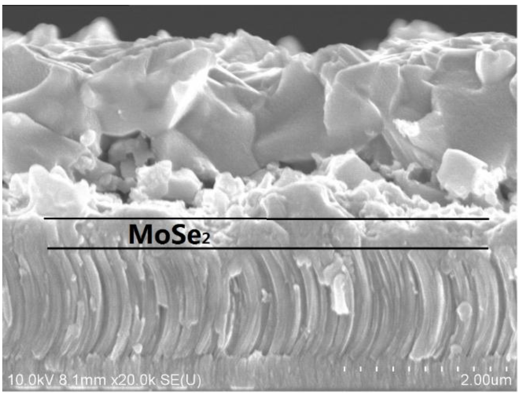 - Shin, B.; Bojarczuk, N.A.; Guha, S. On the kinetics of MoSe2 interfacial layer formation in chalcogen-based thin film solar cells with a molybdenum back contact. Appl. Phys. Lett. 2013, 102, 091907. [Google Scholar] [CrossRef]