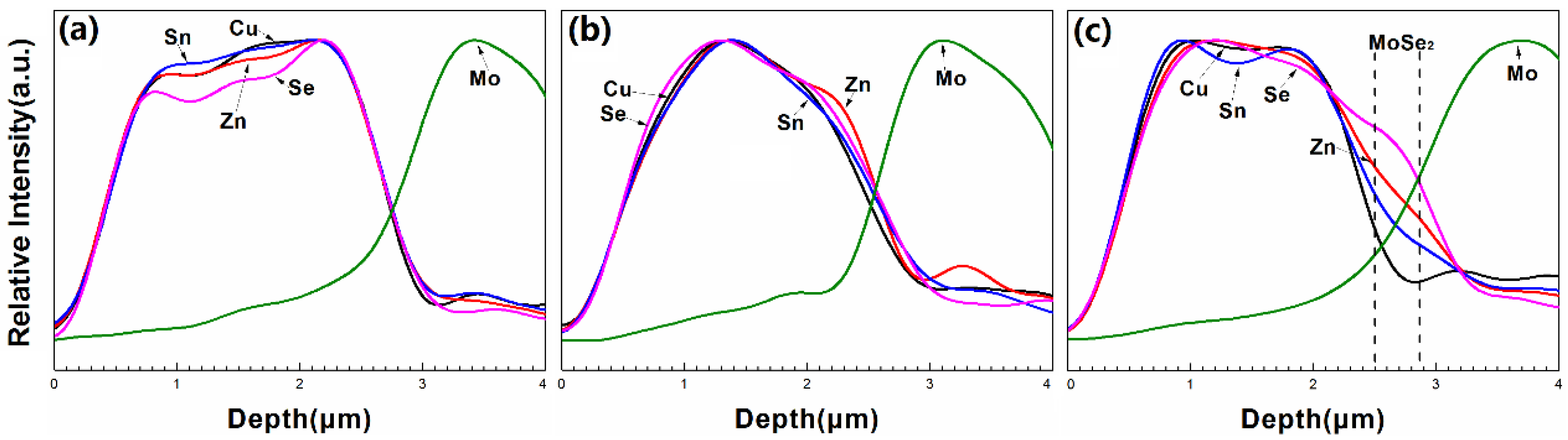 Figure 7 presents the two dimensional surface profiles of the CZTSe films that correspond to Figure 5d–f, respectively. The root-mean-square (RMS) roughness for samples A1, A2, and A3 are 245.8, 122.3, and 105.8 nm, respectively. A high rough surface was obtained when the metal precursor was Sn-poor, consistent with the SEM observations in Figure 5. The liquid Cu2−xSe phase promotes grain growth and forms a rough surface during selenization. Figure 8a–c present the line scanning EDS depth profiles of the CZTSe films that correspond to Figure 5a–c, respectively. Figure 8a presents a uniform element distribution of Cu, Sn, Zn, and Se element from surface to the CZTSe/Mo interface. Figure 8b presents weak Sn, Zn, and Se element signals from the CZTSe/Mo interface, corresponding to a thin interface layer of secondary phases. However, in Figure 8c, clear Sn, Zn, and Se element signal are obtained from the CZTSe/Mo interface, corresponding to a thick interface layer that comprises secondary phases. Figure 9 present the SIMS depth profiles of the CZTSe films that were prepared by the selenization of the precursor with samples A1, A2, and A3, consistent with the line scanning EDS observation in Figure 8. The excess signals of Se and Zn elements from the observation of line scanning EDS or SIMS measurement indicate that ZnSe secondary phases possibly exist at the back contact. The secondary phases of ZnSe at the back contact may introduce a high series resistance and degrade the performance of solar cells [29,30]. The Se signal diffuses deeply into the Mo substrate, indicating that a thick MoSe2 layer formed at the CZTSe/Mo interface, consistent with the XRD observation in Figure 4b.