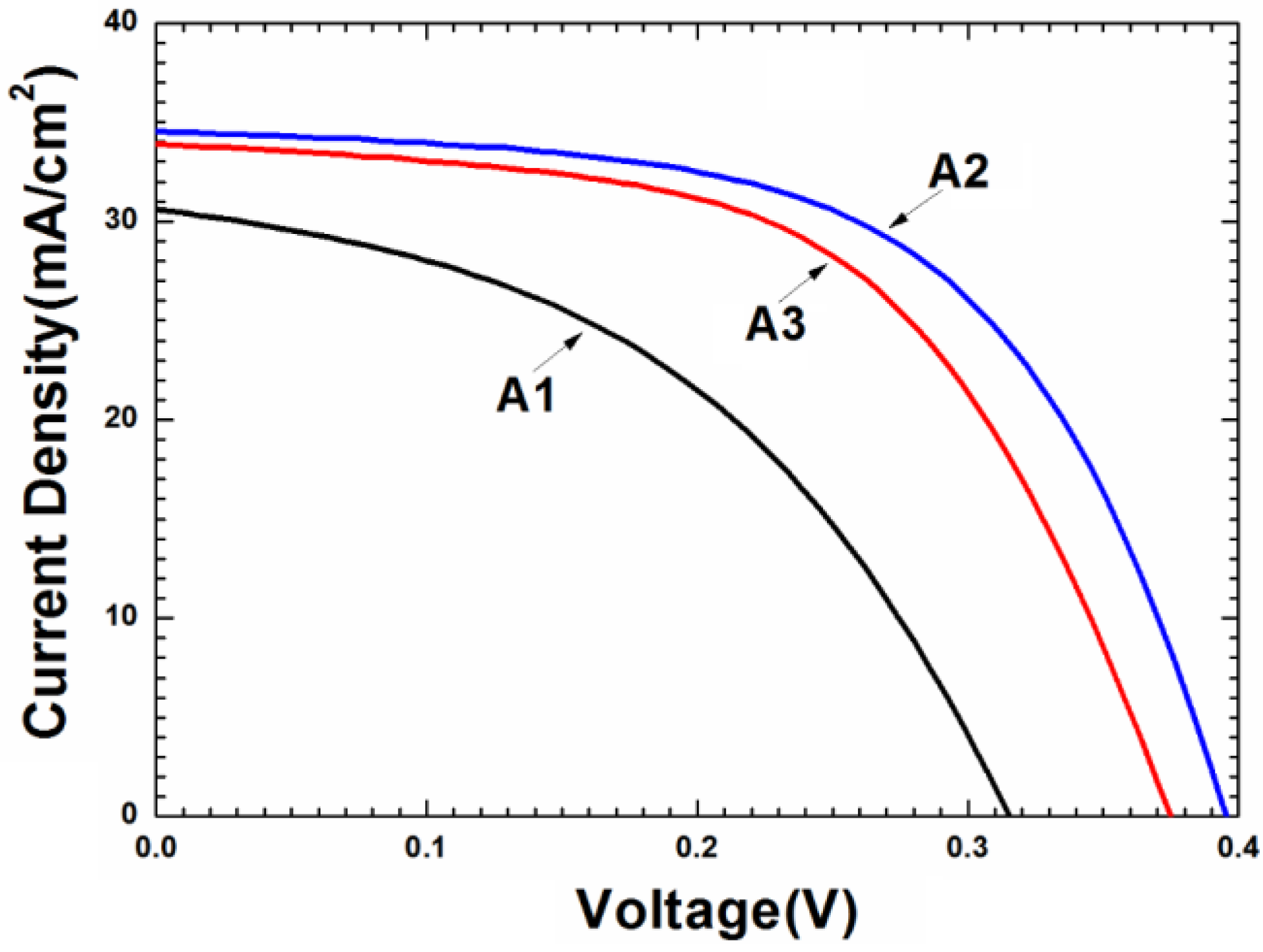 Current-voltage (I-V) curves of three CZTSe solar cells by using films that were formed by the selenization of the precursor with samples A1, A2, and A3.