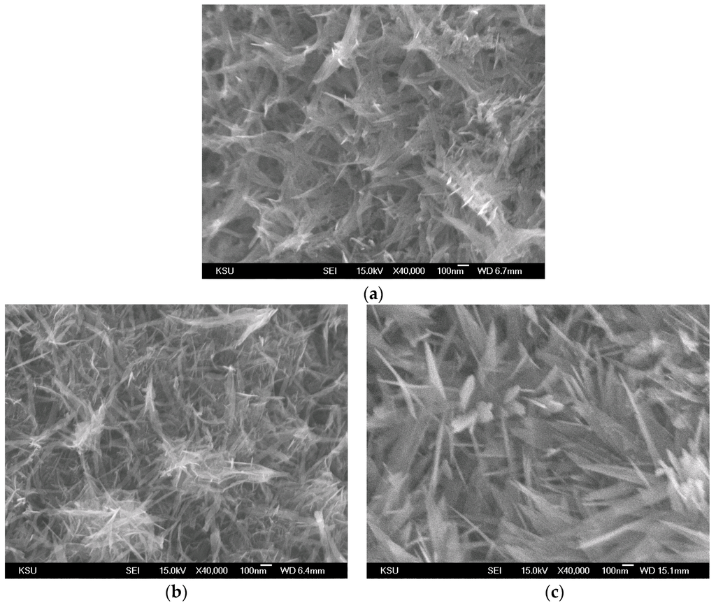 The X-ray diffraction (XRD) patterns of the obtained samples were measured using an X-ray diffractometer (PANalytical X’Pert PRO, Eindhoven, The Netherland) with Cu radiation (λ = 0.15418 nm) in the 2θ range of 20°–60°. The surface morphology was examined using scanning electron microscopy (SEM, JEOL JSM-6700F, Peabody, MA, USA). The surface area and pore volume of the MnO2 powders, scratched from the MnO2/Ni composite, were determined using a volumetric sorption analyzer (Micromeritics ASAP 2020, Norcross, GA, USA).