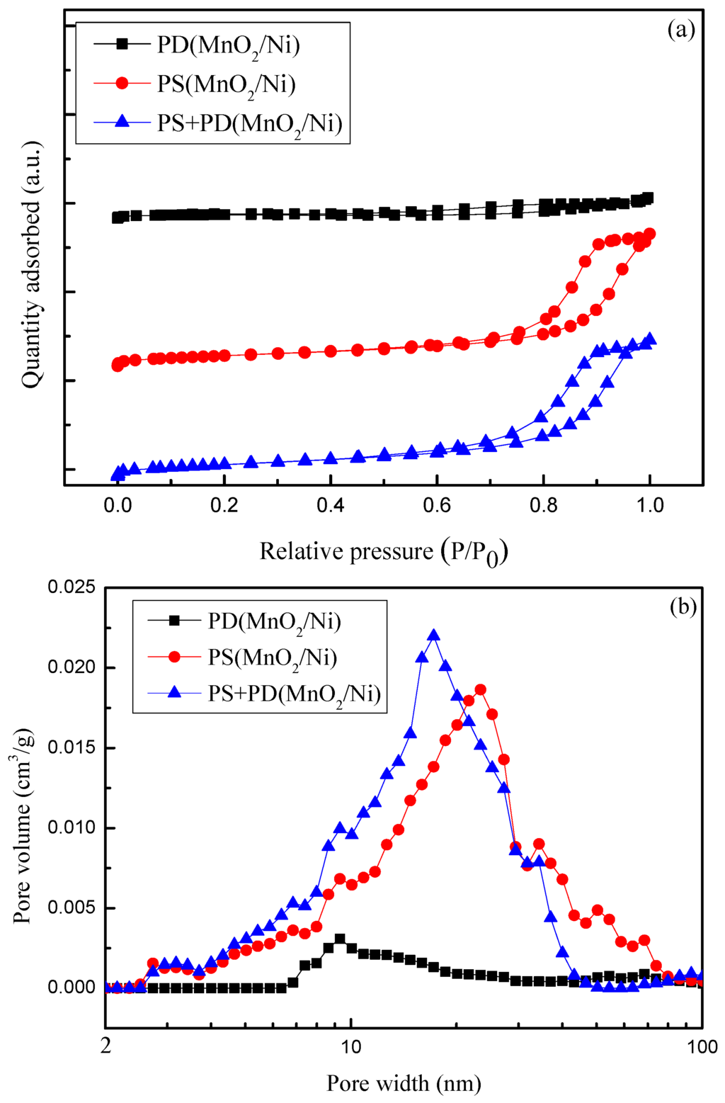 (a) N2 adsorption/desorption isotherms; and (b) corresponding pore size distributions of PD(MnO2/Ni), PS(MnO2/Ni), and PS + PD(MnO2/Ni).