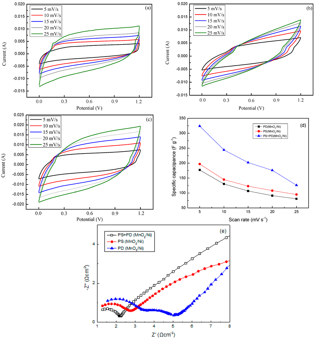 Cyclic voltammograms of (a) PD(MnO2/Ni); (b) PS(MnO2/Ni); (c) PS + PD(MnO2/Ni) electrodes obtained at various scan rates; and (d) plots of specific capacitance vs. potential scan rate; and (e) Nyquist plots of PD(MnO2/Ni), PS(MnO2/Ni), and PS + PD(MnO2/Ni) electrodes.