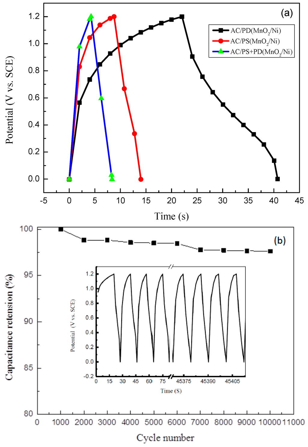 Performance of asymmetric AC/MnO2 device using MnO2/Ni as positive electrode and AC as negative electrode. (a) Charge-discharge curves of AC/PD(MnO2/Ni), AC/PS(MnO2/Ni), and AC/PS + PD(MnO2/Ni); and (b) cycling stability test of AC/PS + PD(MnO2/Ni) device.