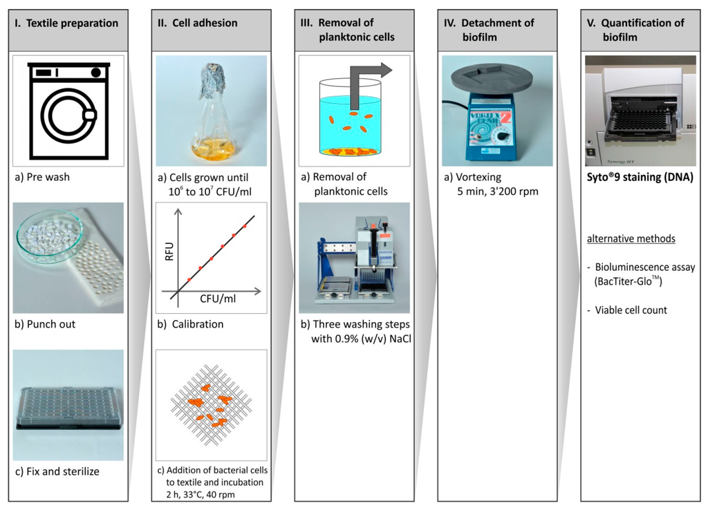 Work flow of microplate screening to quantify bacterial attachment to textile coatings. SYTO9 staining was applied for the large screening, alternative techniques such as bioluminescence assay and viable cell count were tested as well.