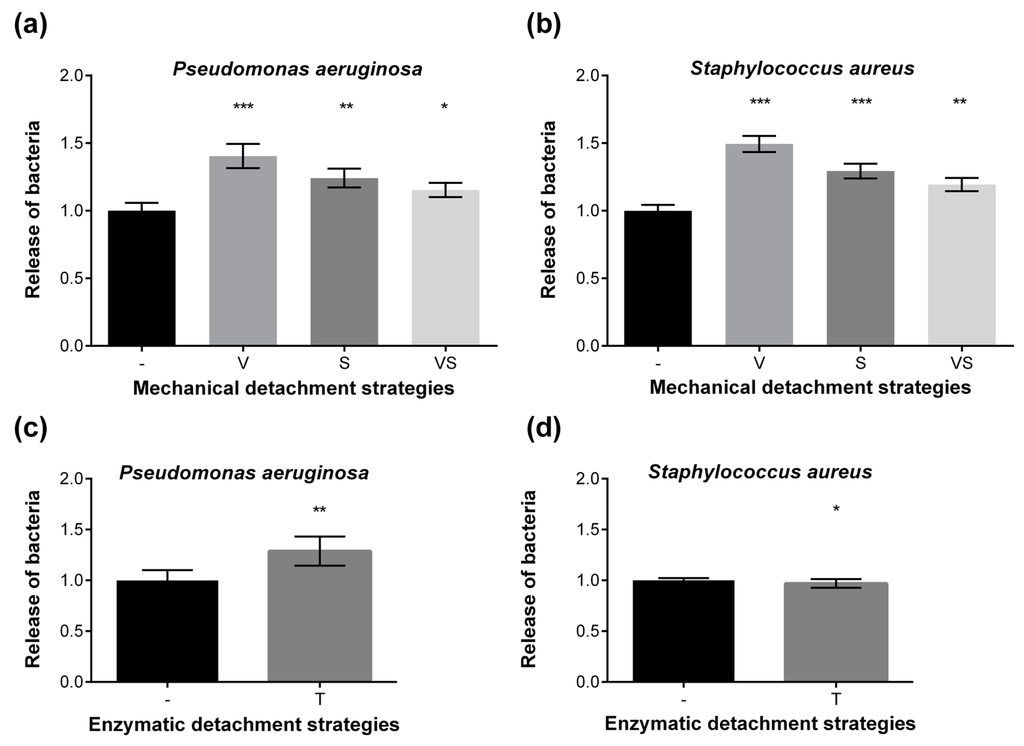Mechanical (a,b) and enzymatic (c,d) detachment of P. aeruginosa (a,c) and S. aureus (b,d) cells from textiles. Comparison of mechanical (-: no treatment, V: vortexing, S: sonication, VS: vortexing plus sonication) and enzymatic (-: no enzymes, T: trypsin) strategies to dislodge attached bacterial cells from cotton. The release of bacteria cells was calculated for each dislodgement technique by comparing untreated controls (no mechanical or enzymatic detachment) which were set as 1.0. The experiment was repeated twice independently with a sample number of n = 31 per condition for mechanical treatment, and n = 16 for trypsin treatment. Columns are displayed as means, error bars are shown as plus/minus standard error of the mean. Statistical analyses were performed via the unpaired, parametric, two-tailed Student’s t-test. *** p < 0.001; ** p < 0.01; * p ≤ 0.05 vs. no treatment/no enzymes.