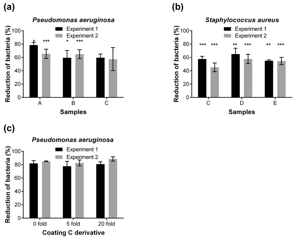 Screening of anti-adhesive coatings using the microplate assay. A number of 38 textile coatings on either cotton or polyester textiles were tested for their anti-adhesive properties against the bacterial attachment. The most-promising coatings against P. aeruginosa (a) and S. aureus (b) are shown. Each coated sample type was compared to its uncoated counterpart. The difference between the bacterial adhesion to coated and non-coated fabrics (set as 100%) is displayed as reduction of attached bacteria in percentage. All experiments were repeated twice independently with a sample number of n = 8 per condition. Statistical analyses were performed via the unpaired, parametric, two-tailed Student’s t-test. *** p < 0.001; ** p < 0.01; * p < 0.05; (c) shows the washing resistance of anti-adhesive textile coatings with Coating C derivative. Samples were washed 5 and 20 times, respectively, and tested afterwards for the reduction of P. aeruginosa adhesion (%) using the microplate assay. This experiment was conducted twice independently. The reduction of bacterial attachment kept at more than 80% after 5 and 20 times washing.