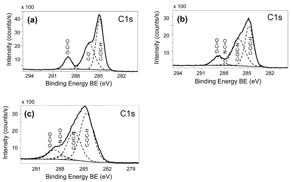 Comparison of high-resolution elemental C1s photoelectron spectra. (a): uncoated PET textile substratum; (b,c): different positions of PLL-g-PEG coated PET textile sample. The bold black line represents the experimental spectrum, the dashed lines are the bands from the curve fitting with corresponding assignments as C–C/C–H (285.0 eV), C–O/C–N (286.4 eV), N–C=O (288.1 eV), and O–C=O (289.0 eV).