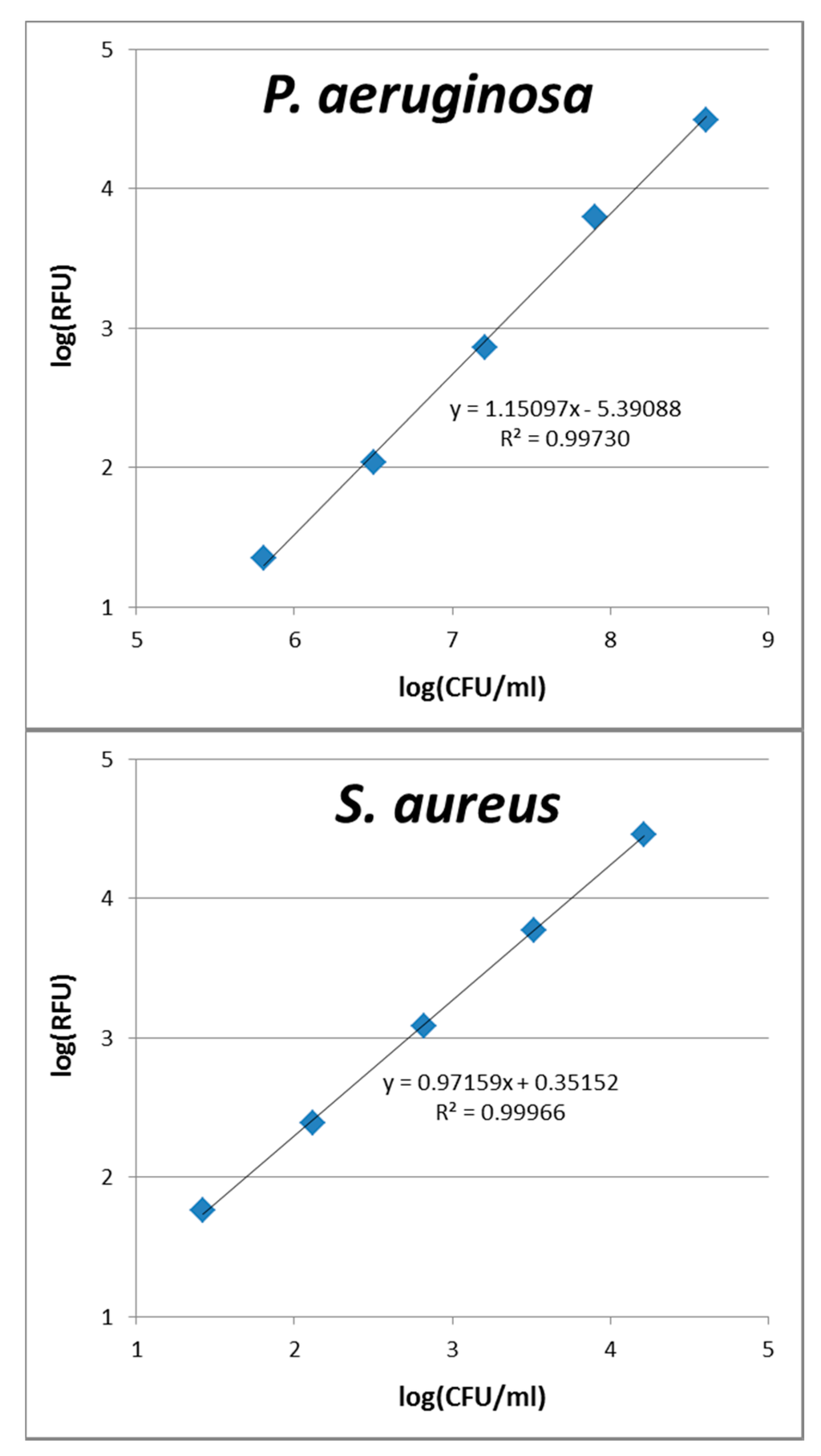 Calibration curves of cell count (logCFU/mL) and relative fluorescence intensity (logRFU) for P. aeruginosa (upper panel) and S. aureus (lower panel).