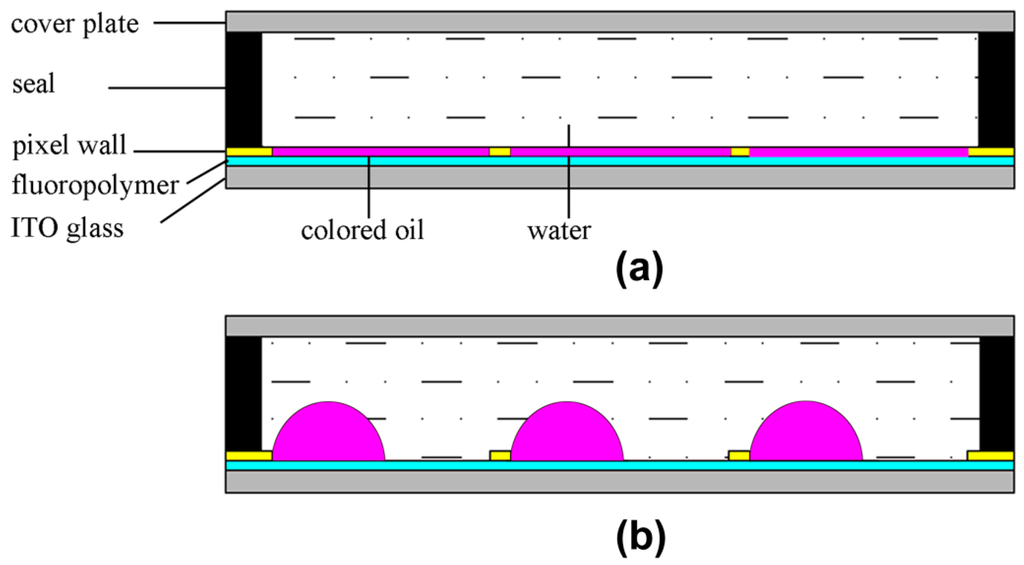 The electrowetting effect is usually ascribed to Lippmann [1] who in 1875 made an early electrocapillary investigation. The modulation and reversibility of electrowetting on bare electrodes is usually limited by electrolysis when a few hundred millivolts are applied. In the 1990s, Berge [2] improved performance greatly by introducing an insulator layer to separate the conductive liquid from the metallic electrode, so-called electrowetting on dielectric (EWOD). In this way device electrowetting modulation and switching reliability could be significantly improved. Applying the voltage across the insulator/water interface changes the distribution of charges and decreases the contact angle of the droplet on the insulator layer [3,4]. In other words, the hydrophobicity of the insulator layer is reduced by the applied voltage. The electrowetting principle has spawned many interesting applications including lab on chip that allows for chemical reactions [5,6], splitting and mixing [7,8] and detection [9,10] of microdroplets as well as microelectromechanical systems (MEMS) like switches, latching relays, micropumps [11,12], adjustable microlenses [13] with a variable focal length and fiber optics [14,15] for switching light. Hayes and Feenstra [16] prototyped ePaper displays based on electrowetting. Low power consumption, sunlight readability, wide viewing angle and switching speed are the collective advantages of Electrowetting Displays (EWD)/EFD [3,16,17] over other reflective display technologies. The technology is suitable for a wide range of display applications from smart wearables to large-area outdoor display screens. The basic architecture consists of a pixelated substrate electrode, a hydrophobic insulator layer, pixel wall that confines the colored oil, the two fluid layers (non-polar colored oil and polar aqueous solution) and the common electrode. The device is sealed with an adhesive at the cell edge. Without electric field, the oil film wets the hydrophobic insulator layer, showing the oil’s color (Figure 1a). When a voltage is applied, the colored oil will be moved into the corner of the pixel, as the water wets the insulator. In this manner the pixel can become up to 85% transparent and ambient light reflects from the external white reflector (Figure 1b).
