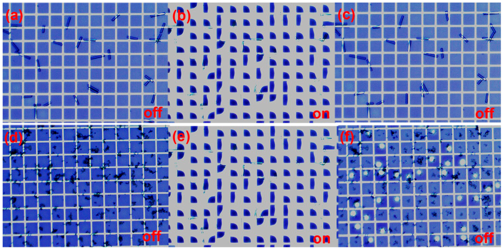 These images show an off/on/off switching cycle with and without voltage (30 V) after adding the rod (a–c)) and sphere (d–f) spacers into our EFD panels. The rod spacers (diameter: 30 μm, length: 90–220 μm) were supplied by Nippon Electric Glass Co., Ltd. (Osaka, Japan) The sphere spacers (average particle diameter: 15 μm ± 0.1 μm) were supplied by Sekisui Chemical Co., Ltd (Osaka Japan). The pixel size was 150 μm. The rod spacers interfered less with the fluidic motion as in most cases they were able to bridge the pixel wall structure and not contact the oil/insulator interface.