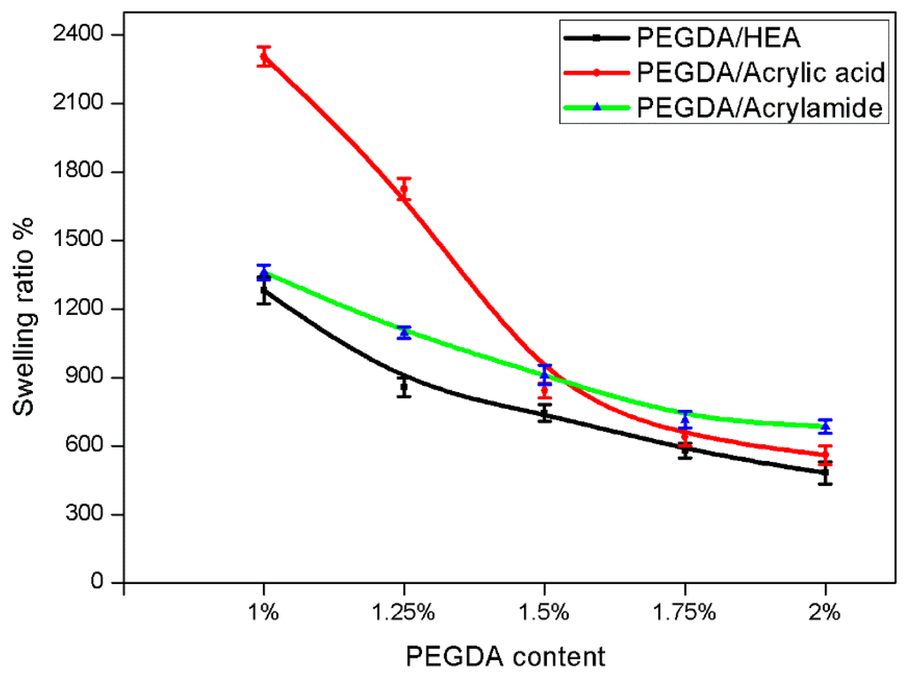 Hydrogels can swell to a considerable extent in water solutions. The swelling behavior of PEGDA hydrogels was investigated as a function of PEGDA content. The mesh size and swelling ratio of the hydrogels can be controlled by the different molecular weight of the polymer. Larger polymer molecular weight corresponds with larger mesh size [36,37]. The swelling ratio increases as the PEG molecular weight increases. In view of the mechanical requirements for spacers in our EFD devices we chose the lower molecular weight of PEGDA (MW = 250). Figure 3 quantitatively illustrates how the swelling ratio decreased with increasing PEGDA content. This is because the degree of cross-linking affects the swelling ratio of the hydrogels, the higher the degree of cross-linking with increasing the PEGDA content, the more difficult for water molecules to penetrate into the hydrogel network. Figure 3 shows that the swelling ratio of PEGDA/HEA hydrogels is less than PEGDA/acrylic acid and PEGDA/acrylamide hydrogels. This could be attributed to the more complete hydrolysis and stronger water uptake ability of acrylic acid and acrylamide.