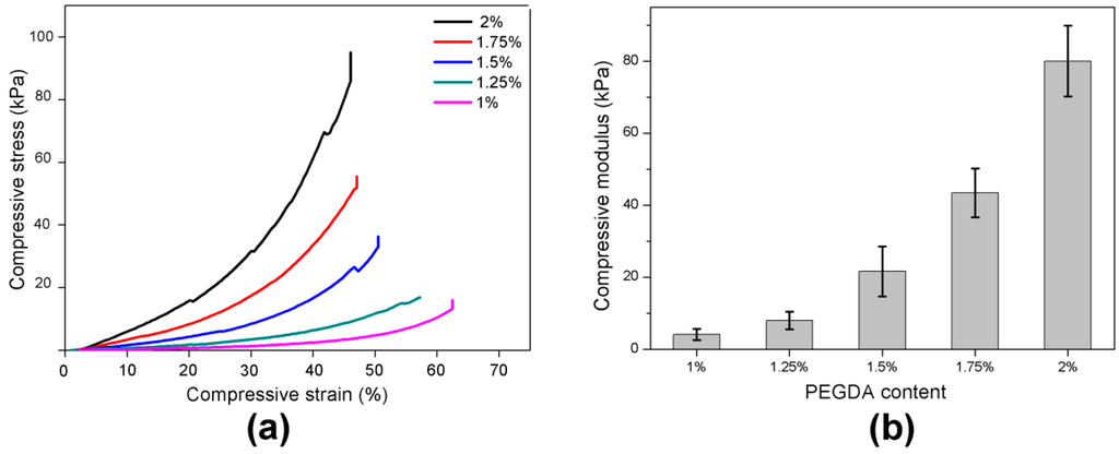 Mechanical properties of PEGDA hydrogels were determined by unconfined compression tests with the mechanical tester. Figure 4a demonstrates stress-strain curves of hydrogels swollen to maximum water content (no inhibitor) with different PEGDA content. The material is biphasic and as such the modulus increases with compression as shown in [38]. The stiffness of the hydrogel networks was determined by evaluating the compressive modulus from the gradient of the stress-strain curves in the linear “toe” region (5%–15%) [38]. The compressive modulus increased from 4 ± 2 kPa to 80 ± 10 kPa when PEGDA content increases from 1% to 2% (Figure 4b).