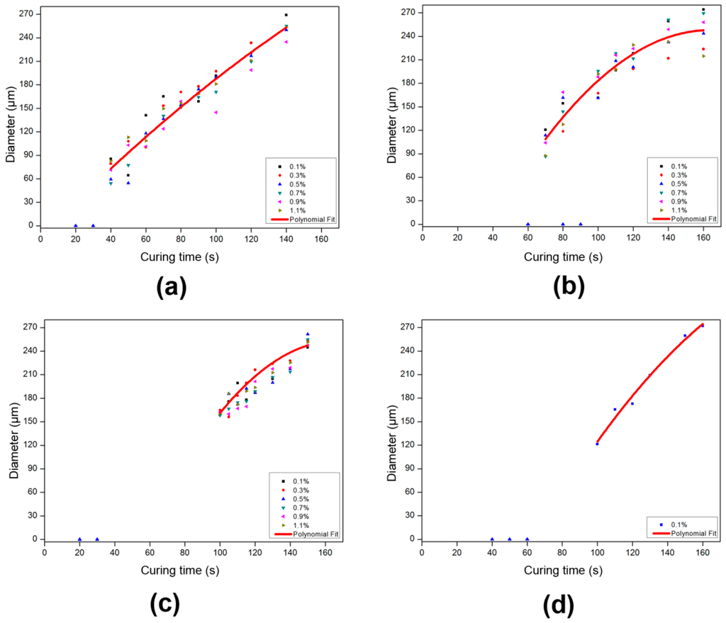 Spacer diameter as a function of curing time for varying inhibitor concentration. Curves correspond to polynomial fits. (a) 20% monomer concentration, 2% initiator, inhibitor varied from 0.1% to 1.1%; (b) 15% monomer concentration, 2% initiator, inhibitor varied from 0.1% to 1.1%; (c) 10% monomer concentration, 2% initiator, inhibitor varied from 0.1% to 1.1%; (d) 10% monomer concentration, 1% initiator, 0.1% inhibitor, The diameter of the spacers in the exposure area were measured by optical microscopic – with at least 5 data points averaged to obtain a representative value in each case. Induction times are 40 s, 70 s, 100 s, and 100 s, respectively from Figure 5a–d.