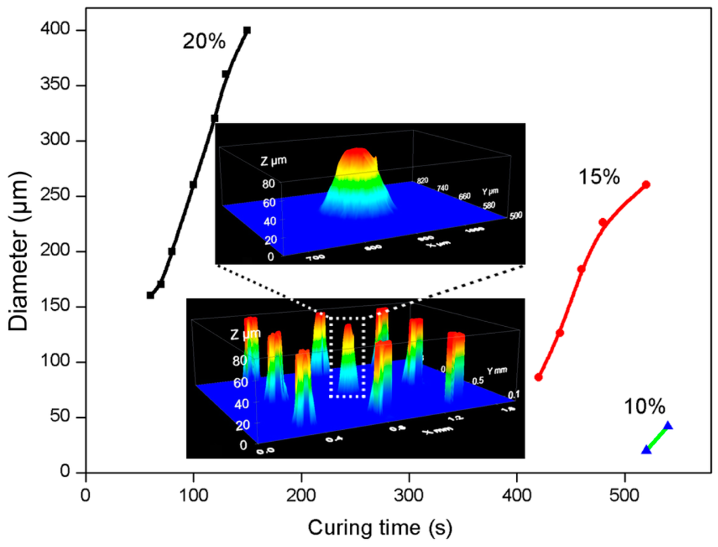 Diameter versus curing time for monomer concentrations of 20 wt. %, 15 wt. % and 10 wt. %. 20um spacer mask, pitch 495 μm. Lamp intensity 780 mW/cm2, the inset shows 3D surface profiles images taken ex situ of spacers on the cover plate (20% monomer concentration, curing time 60 s).