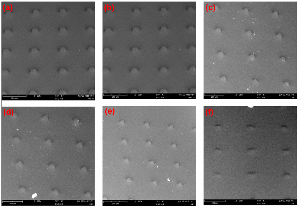 SEM images of spacer arrays formed under various conditions. Water solution: 15% monomer concentration, 2% initiator, inhibitor varied from 0.1% to 1.1%. (a) 0.1%; (b) 0.3%; (c) 0.5%; (d) 0.7%; (e) 0.9%; (f) 1.1%. Lamp intensity 500 mW/cm2, Curing Time 400 s; 20 μm mask aperture in this case.
