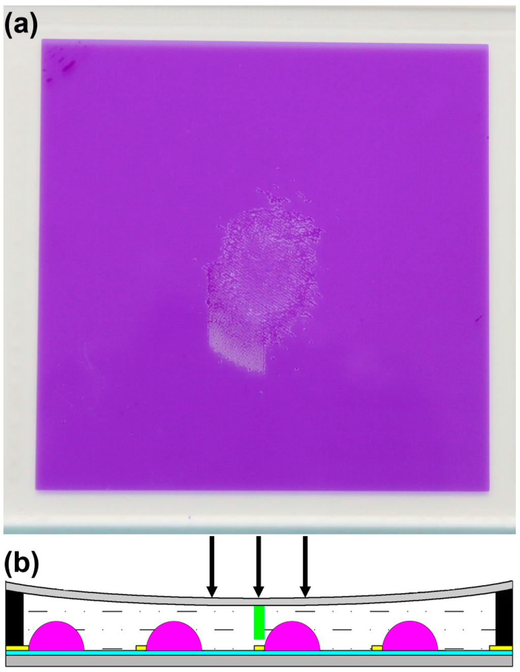 (a) mechanical disturbance causes expulsion of oil from pixels in the middle of the plate (90 × 90cm2); (b) spacer positioning to prevent oil film collapse due to cover plate sag or external pressure.