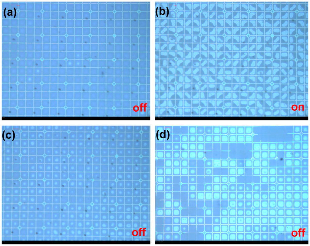 (a–c) These images show the off/on/off switching cycle with and without voltage (30 V) after the column spacers (indicated by the black dots) are grown in EFD devices; (d) the off state showing cell collapse and irreversible oil migration in the area without spacer in the same device.