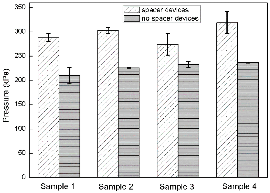 Pressure test of EFD devices with and without spacers. The error bars show the standard deviation from the mean.
