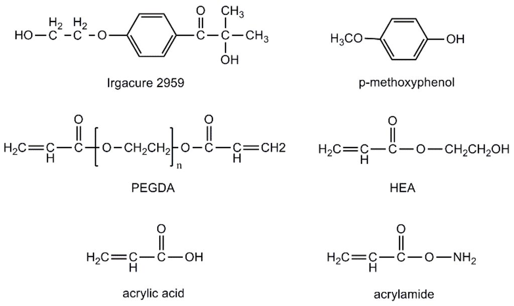 Free radical photoinitiator (2-hydroxy-1-[4-(2-hydroxyethoxy) phenyl]-2-methyl-1-propanone) (Irgacure 2959) (purity: 98%, MW = 224.25) was used to generate the free radicals for the following chain propagation with monomers after UV illumination. Polyethylene glycol diacrylate (PEGDA) (purity: >92%, MW = 250, ρ = 1.11 g/mL) was used as cross-linker to propagate with monomers, 2-hydroxyethyl acrylate (HEA) (purity: 96%, MW = 116.12, ρ = 1.011 g/mL), acrylic acid (purity: 99%, MW = 72.06, ρ = 1.051 g/mL), acrylamide (purity: 99%, MW = 71.08). Photoinhibitor (p-methoxyphenol) (purity: 99%, MW = 124.14) was used to inhibit the polymerization in the neighborhood of the illuminating area for providing a suitable column spacer. All of the materials were purchased from Sigma Aldrich except for the acrylamide which was procured from J&K Scientific Ltd (Beijing, China). All of the materials were used directly without further purification (Figure 11).