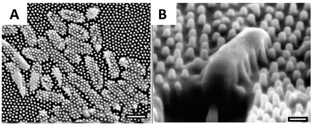 Nanotechnology consists of construction and characterization of nanoscale materials and structures, which may exhibit enhanced physical and chemical properties relative to the bulk materials [9,10]. Anti-microbial nanomaterials have a large surface-area-to-volume ratio, which confers higher active contact surface. Recent advances in nanotechnology have revealed the antimicrobial/antifouling effects of nature-inspired nanoscale topographies, which includes lotus leaves [11,12], cicada wings [13], shark skin [14], feet of gecko [15], wings of dragonflies and butterflies [16,17]. In some studies super-hydrophobicity was hypothesized as a prerequisite to anti-biofouling, as reduced contact area between bacteria and nanostructured surfaces prevents adhesion [18]. Along this line, biomimetic super-hydrophobic surfaces with regular nanoscale topographies have been developed [19,20,21,22]. A closely related and intensively investigated phenomenon is the “lotus effect”, referring to the leaf surfaces of lotus plants, which have binary structures at both microscale and nanoscale, making it possible to trap proportionally large amounts of air and minimize the actual contact area between the water droplets and surfaces [20,23,24,25,26]. Generating nanoscale roughness with materials exhibiting low surface energy is the key factor to constructing these super-hydrophobic surfaces. On the other hand, a mechanism to mechanically kill bacteria was recently discovered on the surface of cicada wings, where arrays of nanopillars penetrate and kill adherent bacteria within several minutes [27] (Figure 1A,B). Inspired by cicada wings, a library of biomimetic nanopillars was prepared on the surface, which was found to have a lower density of adherent bacteria compared to flat films [18,28,29,30]. The geometry of these nanostructures, including the size, spacing and aspect ratio have been demonstrated to be important factors for inhibiting bacterial colonization.
