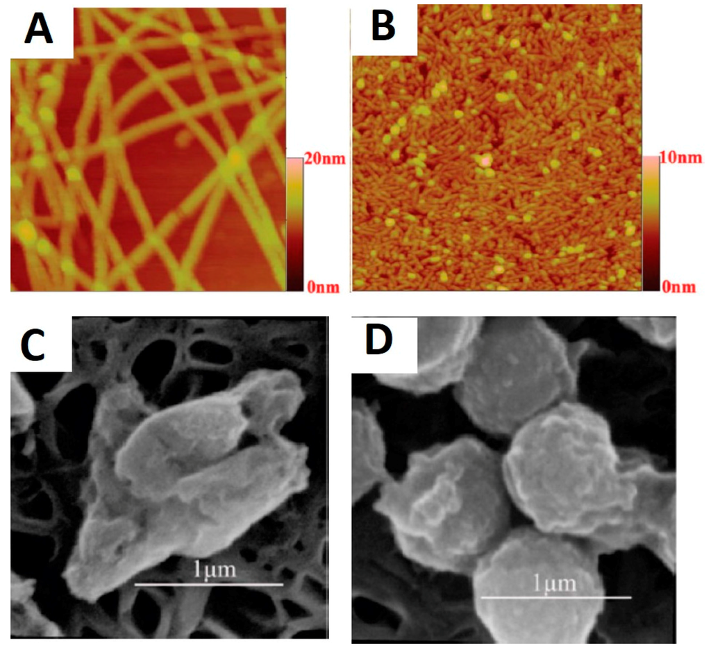 Nanostructures formed by peptide self-assembly as revealed by topographical AFM micrographs formed by: (A) A6K; and (B) A9K. Scanning electron micrographs of: (C) E. coli; and (D) S. aureus treated by A9K. Figures reproduced from [88] with permission from ACS.